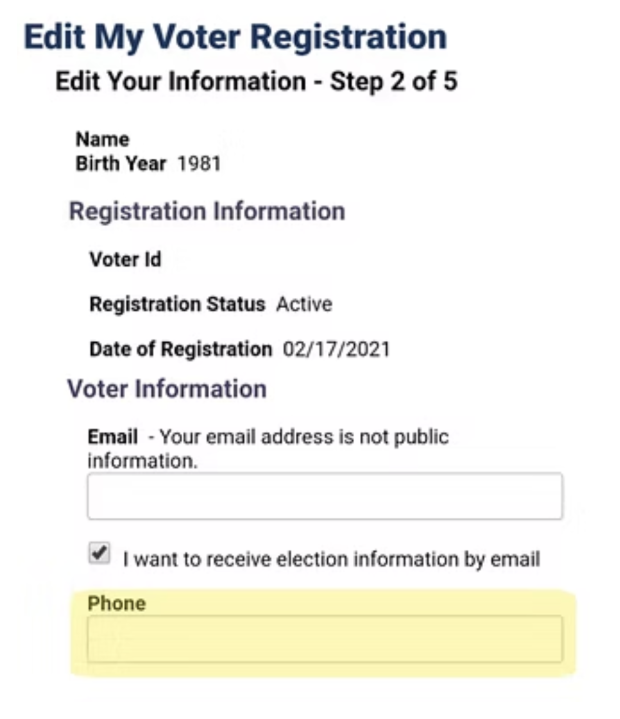 d) On "Edit My Voter Registration," add or update the "Phone" field. Then scroll down and press "Next" until you can "Submit" the changes.